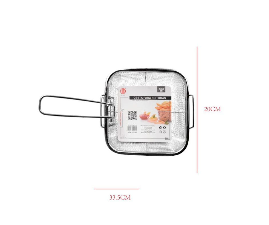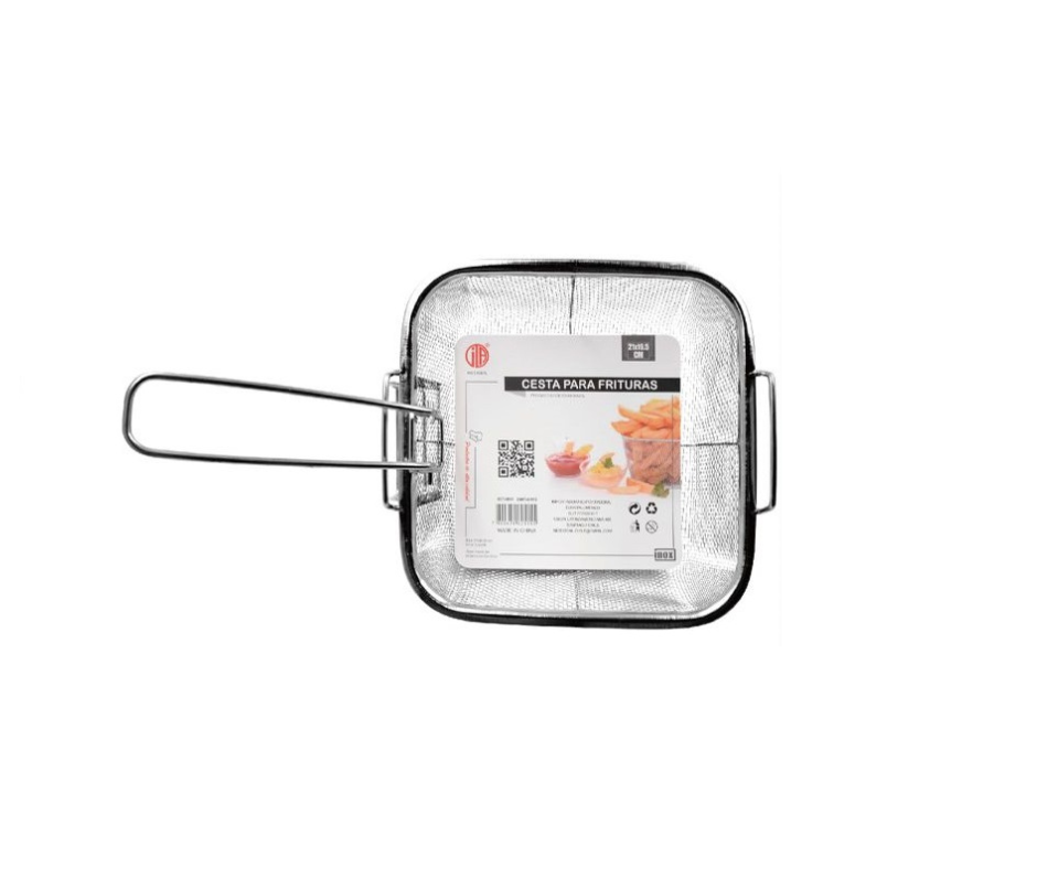 La cesta para frituras es un utensilio robusto y elegante diseñado específicamente para cocinar alimentos fritos de manera eficiente. Fabricada con materiales de alta calidad, esta cesta ofrece durabilidad y resistencia al calor, asegurando una distribución uniforme del calor para obtener resultados óptimos en cada fritura. Su diseño ergonómico y su acabado plateado no solo proporcionan una estética atractiva en la cocina, sino que también facilitan su manipulación y limpieza, convirtiéndola en una opción ideal para cualquier entorno culinario profesional o doméstico Observaciones adicionales: las fotografías y descripción del producto son referenciales. Producto sujeto a stock de colores.